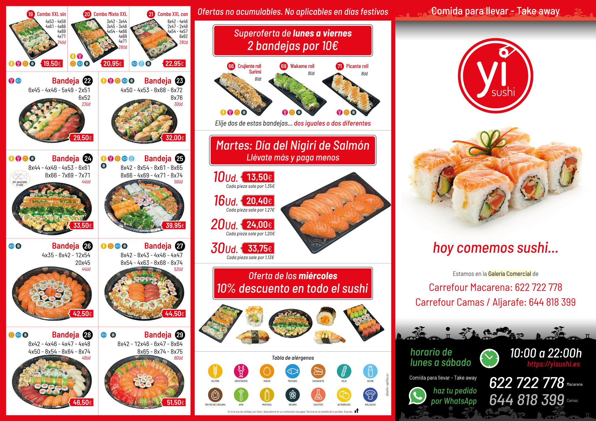 Hoy comemos Sushi hecho en el díaYi Sushi SevillaEstamos en la Galería Comercial de Carrefour Macarena (Ver mapa)teléfono 622 722 778Haz tu encargo de comida para llevar, por Whatsapp (haz clic) – Servicio take awayYi Sushi CamasEstamos en la Galería Comercial de Carrefour Camas / Aljarafe (Ver mapa)teléfono 644 818 399Haz tu encargo de comida para llevar, por Whatsapp (haz clic) – Servicio take awayPídenos un folleto para tenerlo siempre a mano… Nuestra carta Nuestra carta Ven a vernos a Carrefour Macarena y CamasEstamos en la Galería Comercial de Carrefour Macarena (Ampliar mapa)Yi sushi MacarenaEstamos en la Galería Comercial de Carrefour Camas / Aljarafe (Ampliar mapa)Yi sushi Camas